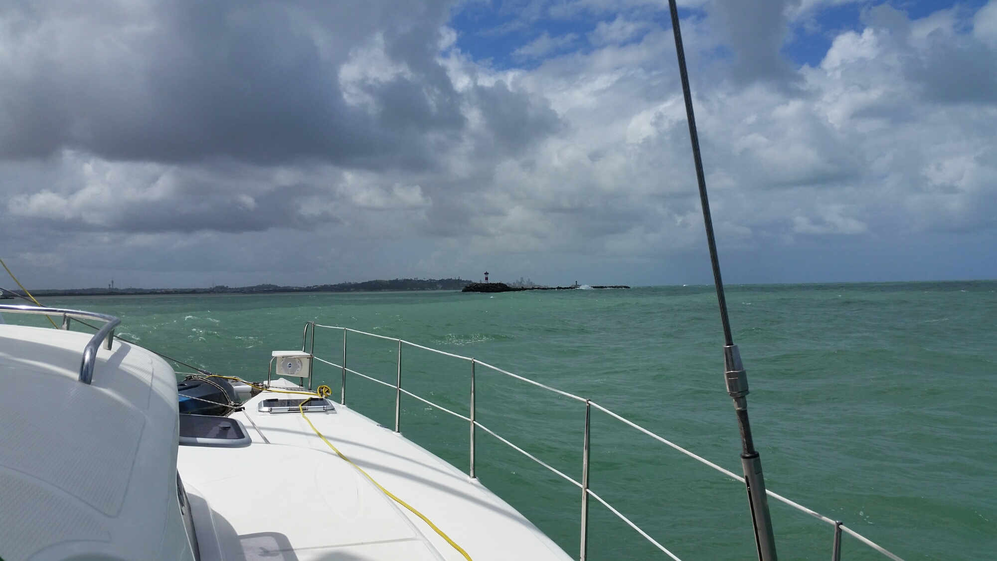 Cerca de 30 nm antes de Recife descobrimos que a alça que suporta o cabo de aço do gurupé , lado BE (boreste), se rompeu. Prendemos com um cabo no cunho e seguimos viagem.