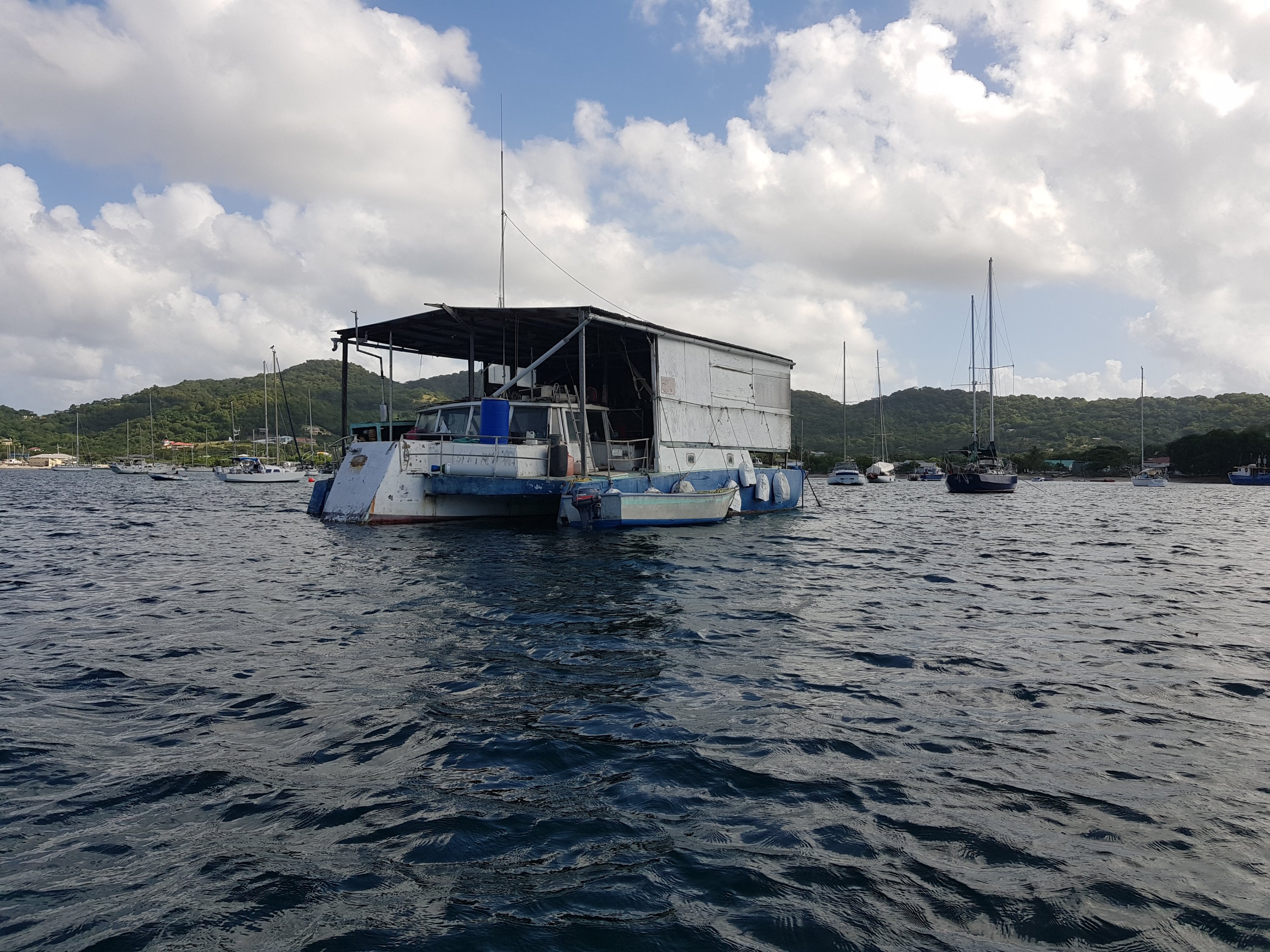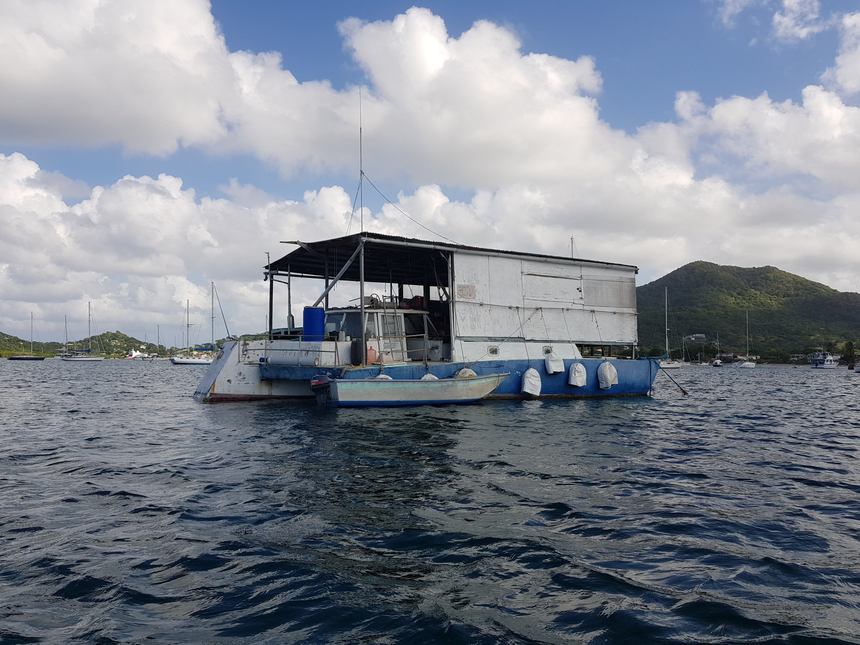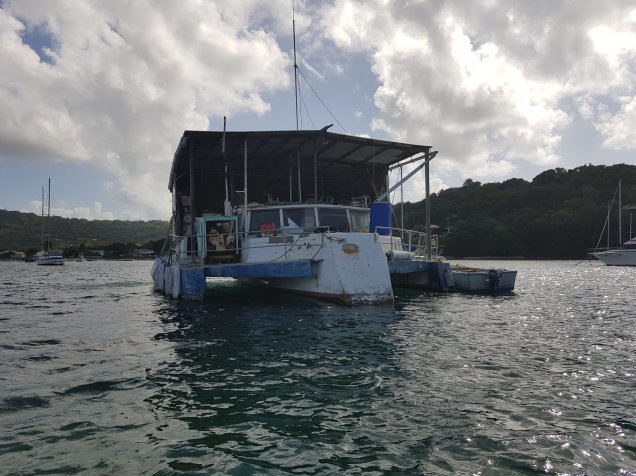 Aqui em Carriacou encontramos o Sr Dominique, especialista em solda Inox e reparos de todo tipo. Ele tem uma oficina instalada num catamarã em pleno oceano, vejam as fotos: Carrinho do Traveler que partiu e a oficina do Dominique instalada num catamarã