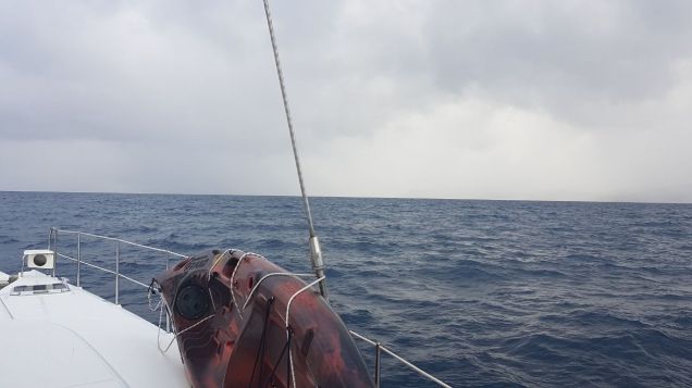 Partimos bem cedo, tempo nublado , ventos na casa de 16 a 18 nós. Vento “E”, vamos bem orçados. Faz um pouco de frio, céu muito nublado. Mar calmo e ondas a favor..