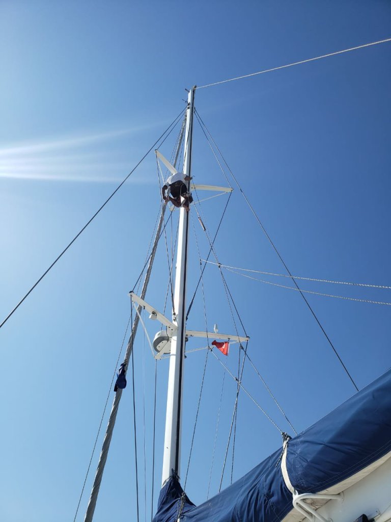 Hoje montamos a Genoa e Neo subiu no mastro pra revisionar tudo lá por cima e novamente tudo ok, só necessário um reaperto nos parafusos da antena de TV.