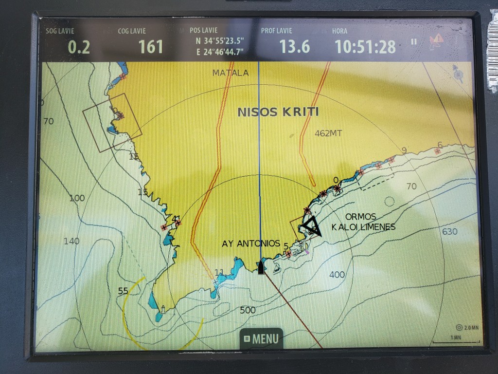 Suspendemos logo cedo para mais um dia de velejada. Tempo bom ensolarado e com ventos na casa de 11 nós. Após 1,5 h de velejada, quando contornamos a ponta da ilha, cabo AK LITHINON, pegamos um mar revolto com ventos de 30 nós levantando ondas de 3 metros bem na proa do LaVie, ainda tentamos seguir, mas era muita pancada no LaVie, achamos melhor voltarmos e esperar o tempo melhorar. Vamos ficar aqui abrigados nessa baía AY ANTONIOS ate o dia 16 , qd as condições meteorológicas devem melhorar. Vamos aproveitar e mergulhar, tentar matar um peixe para o almoço.