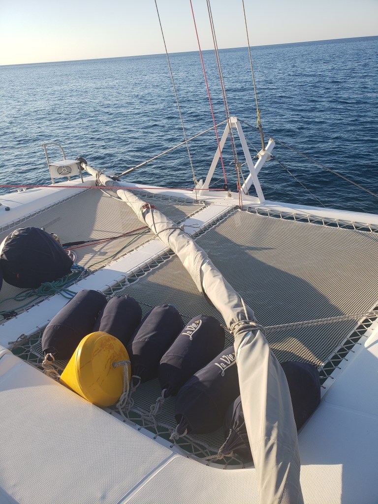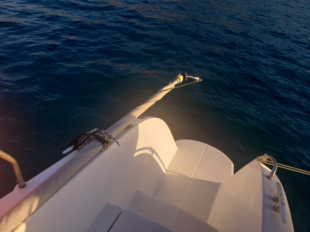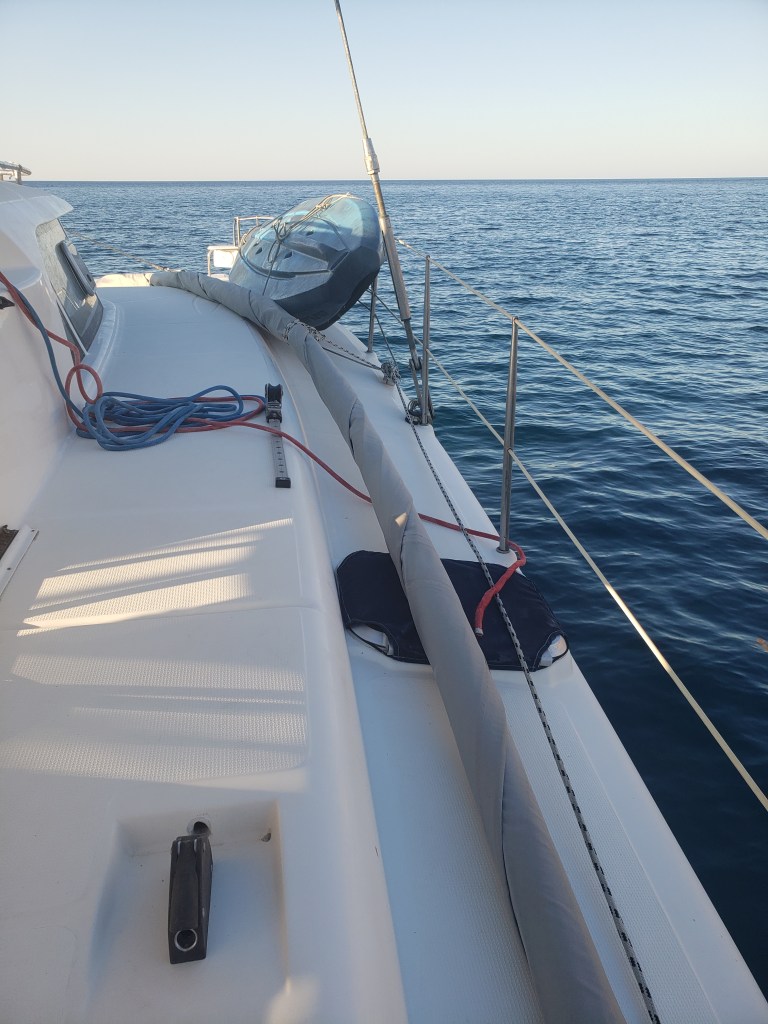 Tivemos que subir no mastro e descer tudo. Colocamos 4 cabos para sustentar o mastro e vamos seguir motorando, não podemos mais usar a vela mestra, a não ser que o vento venha de 100 a 160°. Em nosso rumo isso vai ser impossível, então vamos comprar mais diesel para completar a viagem até Malta. Lá vamos reparar e trocar o cabo de aço.