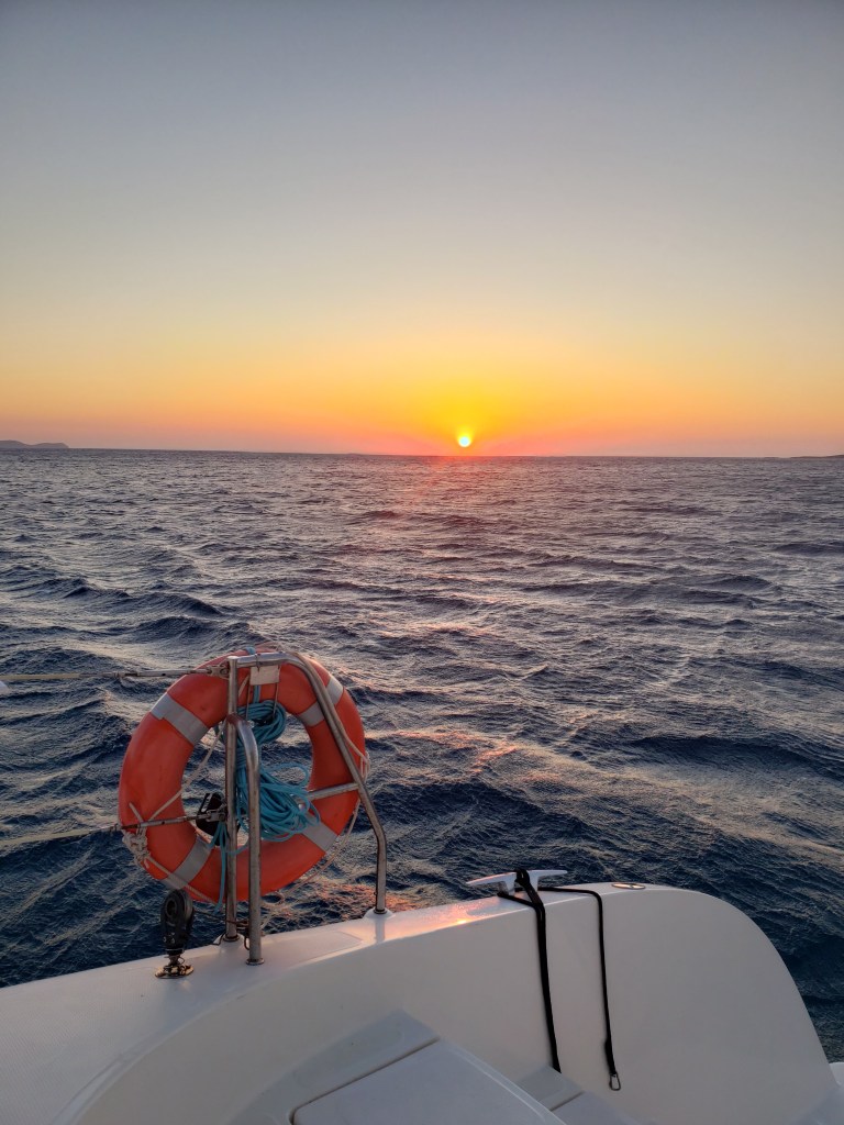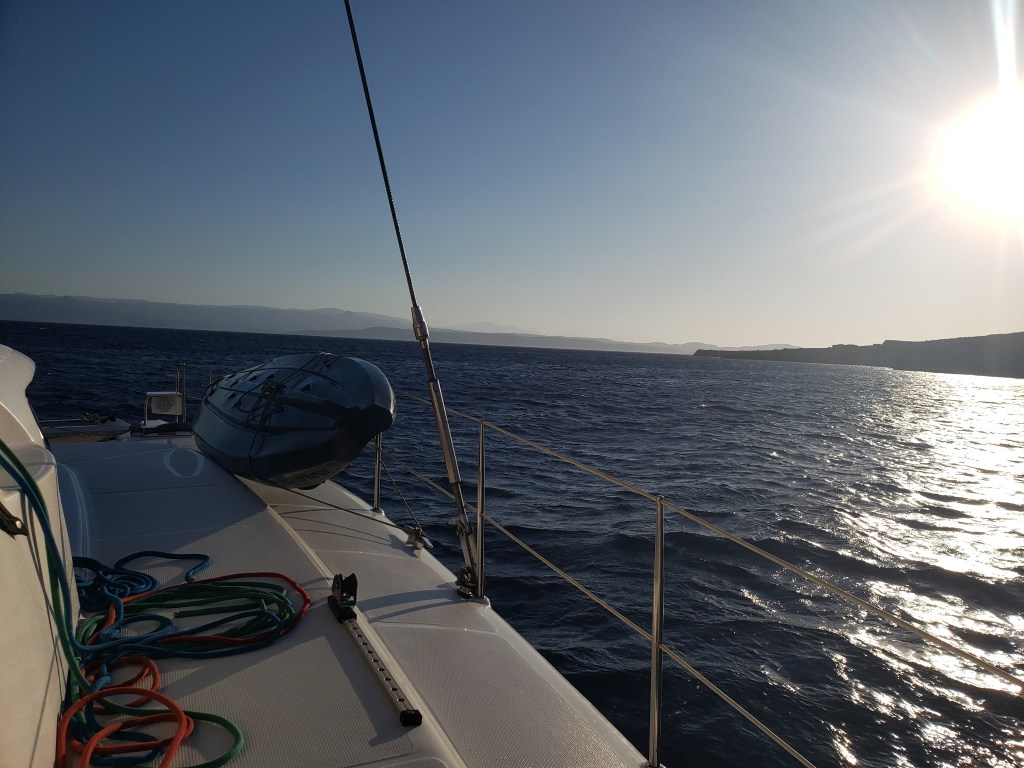 O Sol surgiu no horizonte magestosamente. Passamos a noite aqui em Creta numa baia protegida dos ventos fortes vindo do W. Esses ventos devem continuar assim até o início da tarde. Iremos navegar o dia todo na costa da ilha de Creta e dependendo do vento parar ou não para dormir.