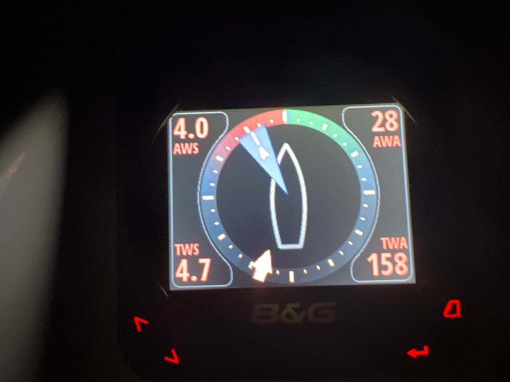 O vento apertou mais ainda, entrando N com mais de 25 de vento Aparente. Demos o 2 riso na mestra e levantamos a genoa no 2 riso também. Agora aguenta até 35 nós, mais que isso retiro velas e vou no motor .