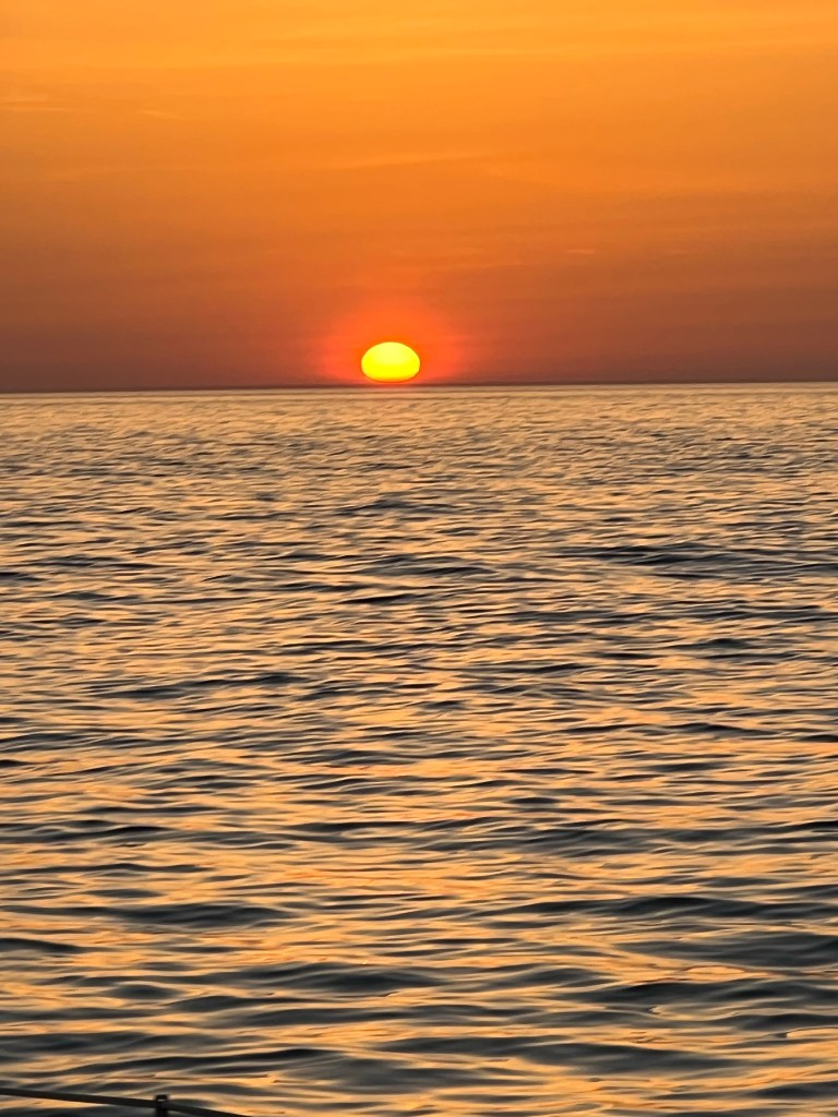 Mar continua calmo e ainda estamos sem vento. Seguimos motorando com mestra em cima para estabilizar o barco.