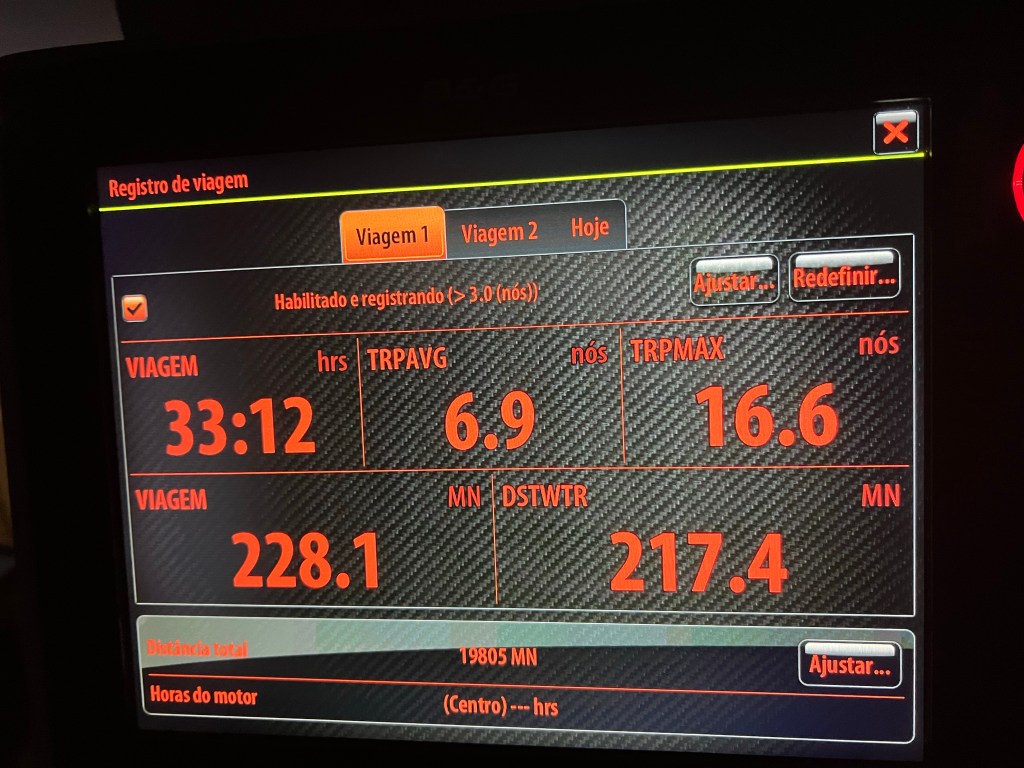 Condição de navegação continua a mesma. Mar calmo, ondas de proa de até 1 m vai balançando o LaVie. Noite escura, lua nova, não dá pra ver nada à frente , sigo navegando por instrumento ( RADAR), coloquei aviso de zona de guarda, qualquer coisa que entrar num raio de 1,8 milhas o alarme toca. O risco de colisão com barcos de pesca é alto nessa região e olha que estamos numa profundidade de mais de 2.000 metros, e o alarme de peixe não para de dar sinal!!