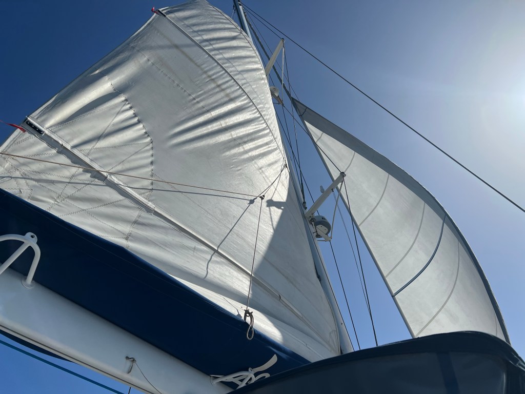 Coloquei a genoa, mas não durou muito tempo, optei por retirar, o barco estava em uma orça muito apertada e a vela panejava demais, fiquei com receio de rasgar.