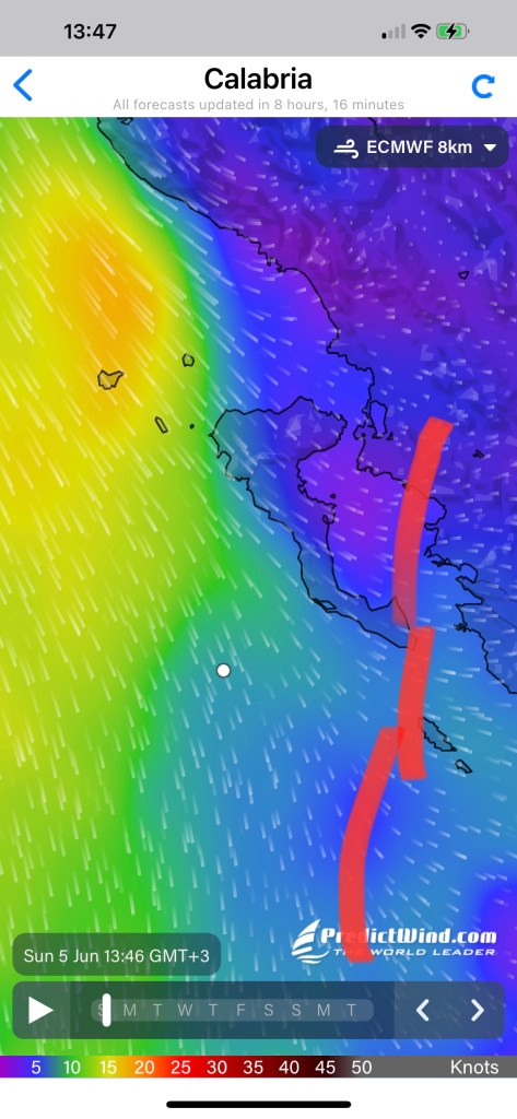 Talvez pela manhã entre um vento melhor, pelo menos é a previsão do PredictWind, porém nessa região o tempo muda muito rápido.