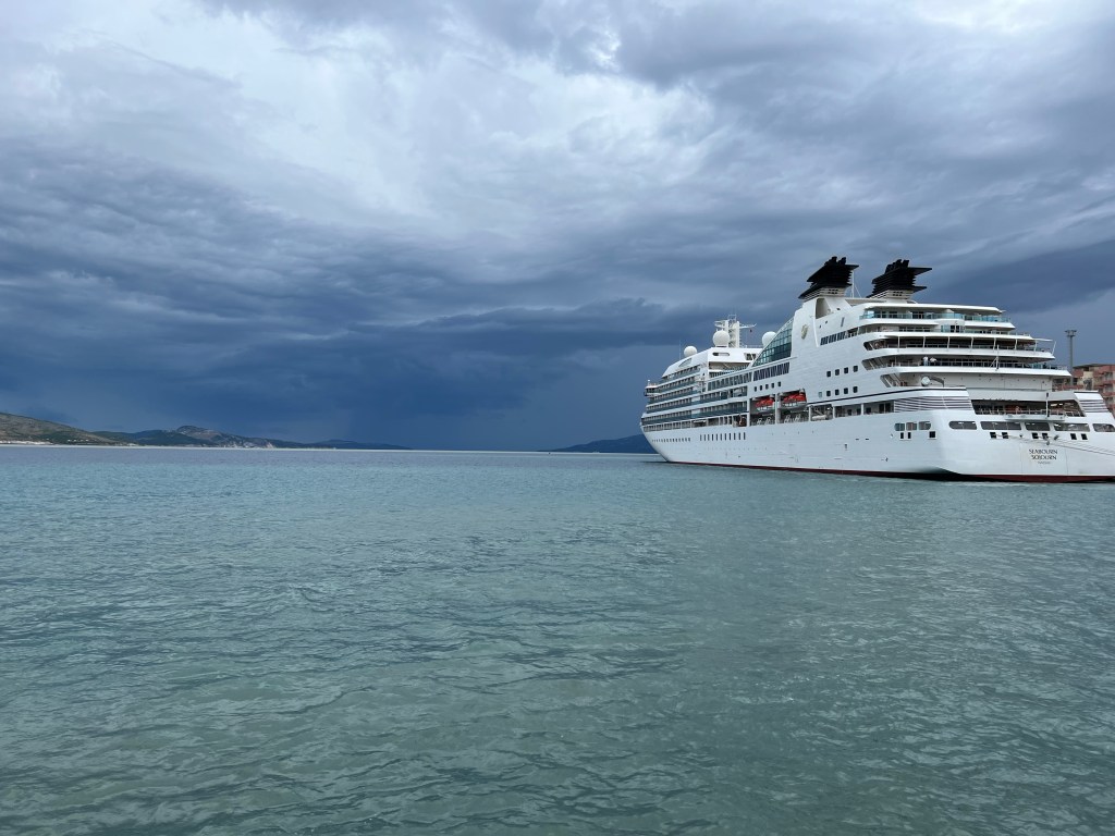 Agora cedo chegou um navio de passageiros, chegou bem pertinho de nós.
