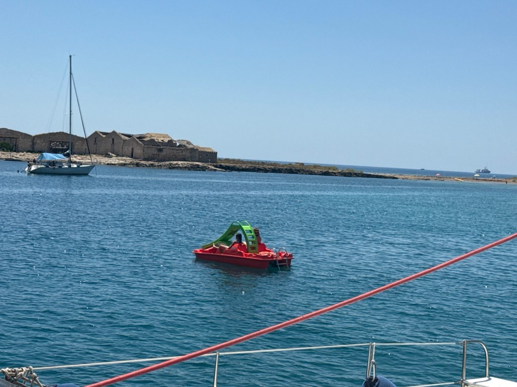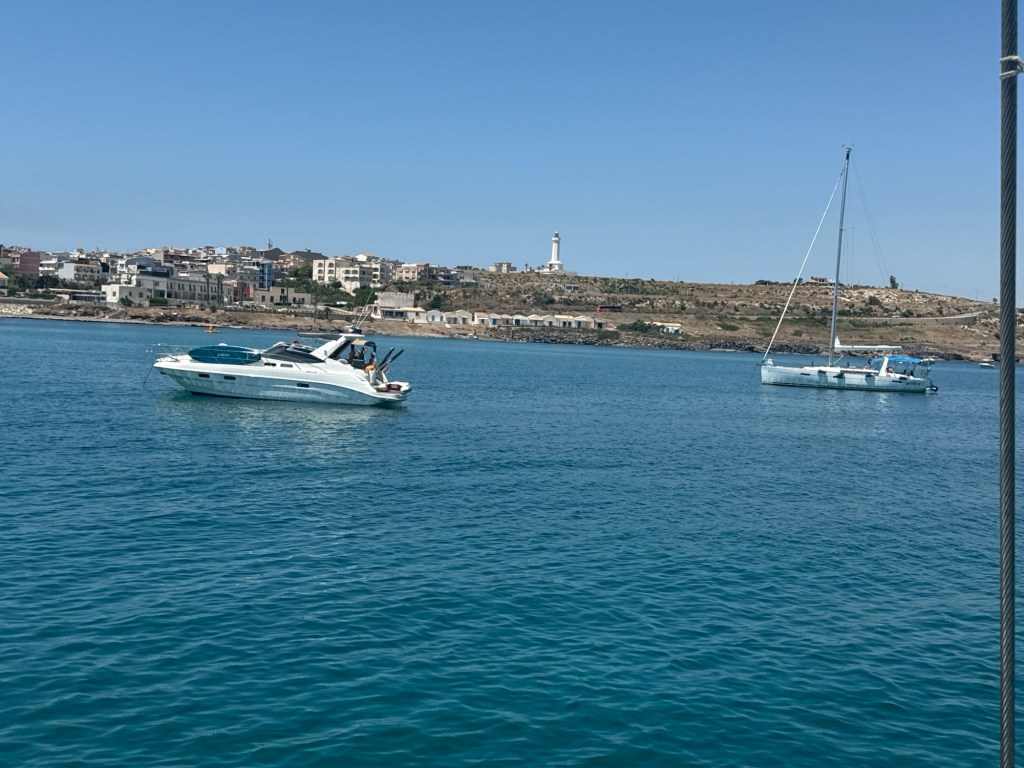 Partimos de Licata para Siracusa – IT, parada rápida na marina de Ragusa para abastecer e depois seguiremos para um pernoite no Porto Palo. Será um deslocamento de 65 milhas. Tempo está bom, céu claro e ensolarado, temperatura na casa de 28 graus celsius, vento fraco, seguimos motorando. Td ok com o LaVie e com a Tripulação (Guilherme, Aline e Neo ).