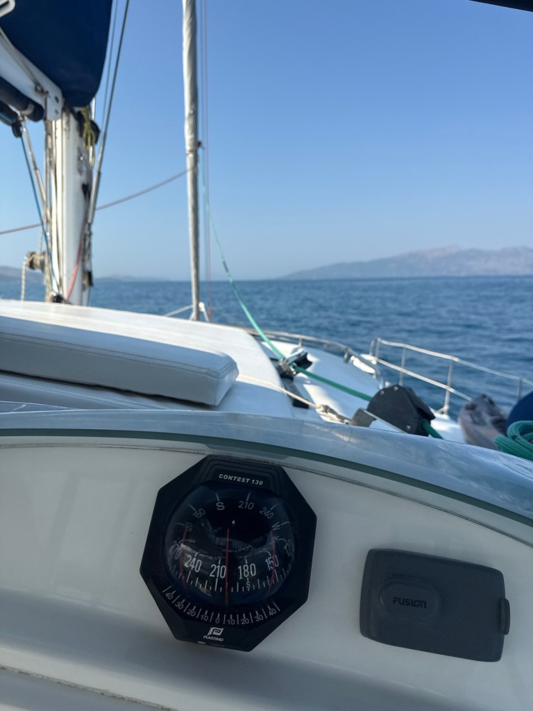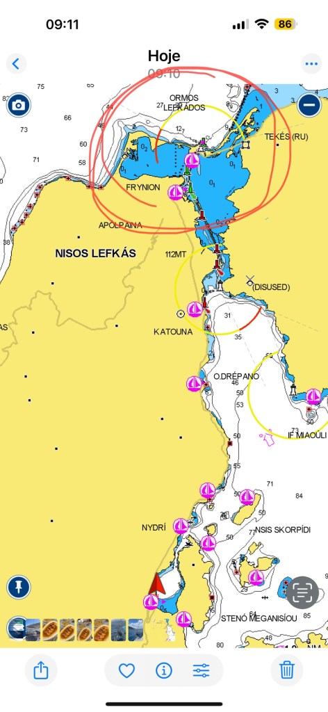 Tudo ok com barco e tripulação, condições climáticas ainda bastante estranha, ontem fez até frio por aqui. Pressão barimétrica começou a cair, mas depois deu sinais de tendência de alta. Na região de Zakhintos( Cefalônia e um pouco de Lefkadas) muitas nuvens carregadas, com trovoada e bastante raios. Em nossa rota tempo bom, contra vento na casa de 12 nos, isso nos obriga a usar motor🤯, quase nada de vela nessa temporada.